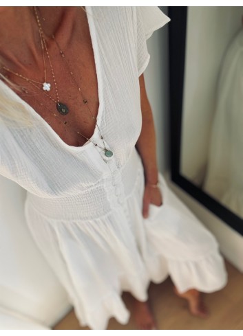 - Decolleté V profond avec cauri brodé