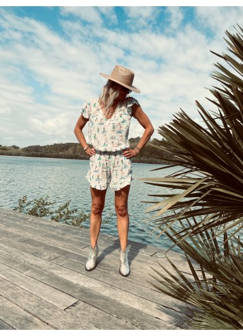 - encolure V profond brodé de coquillages Cauri et pierres turquoises