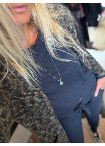 - Décolleté V brodé de coquillages cauris et pierres turquoises