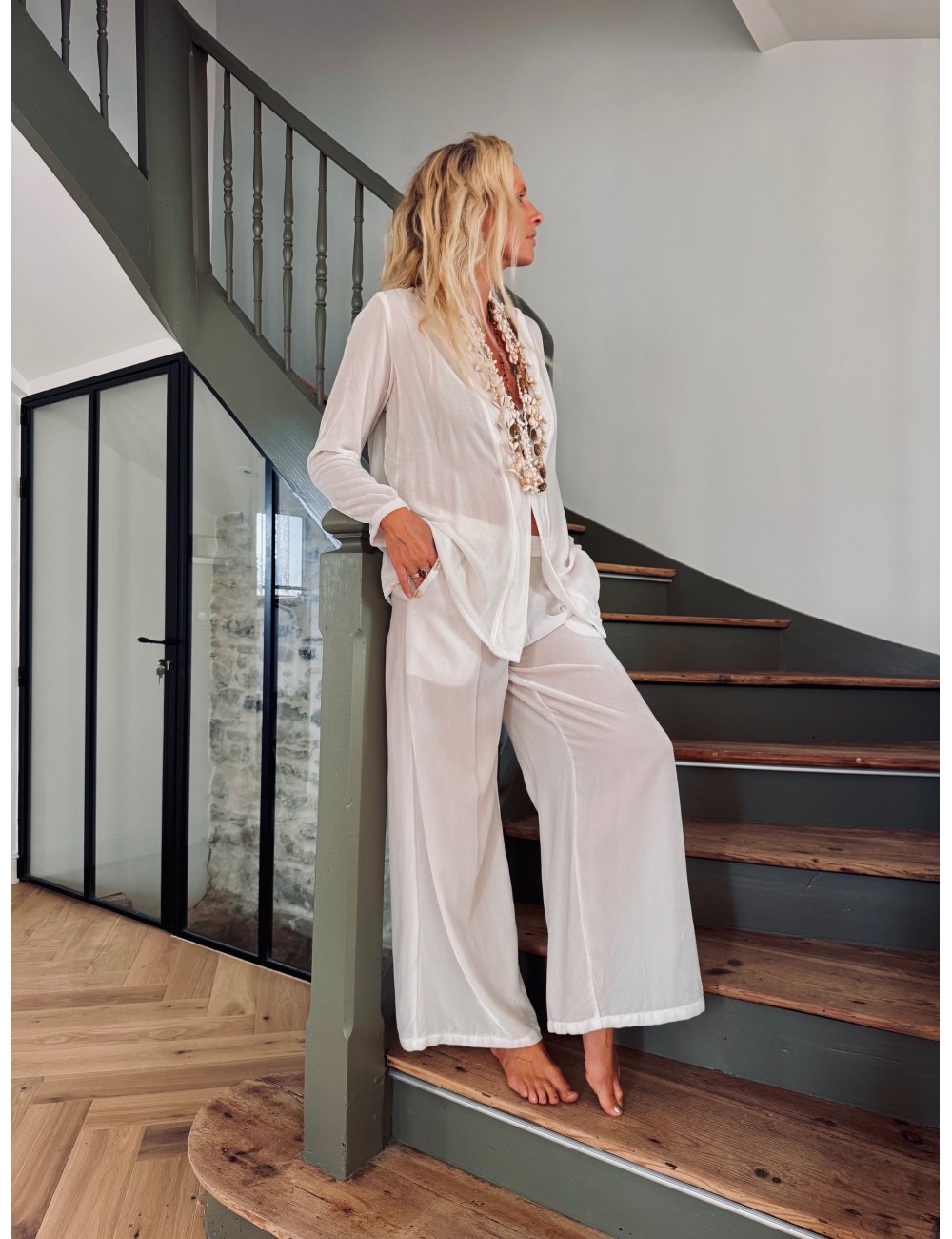 - Coquillages cauris brodés à la taille, entrées de poches et braguette