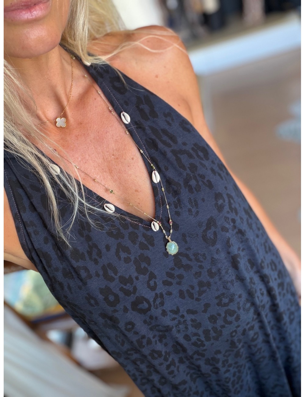 - encolure V brodée de coquillages cauri