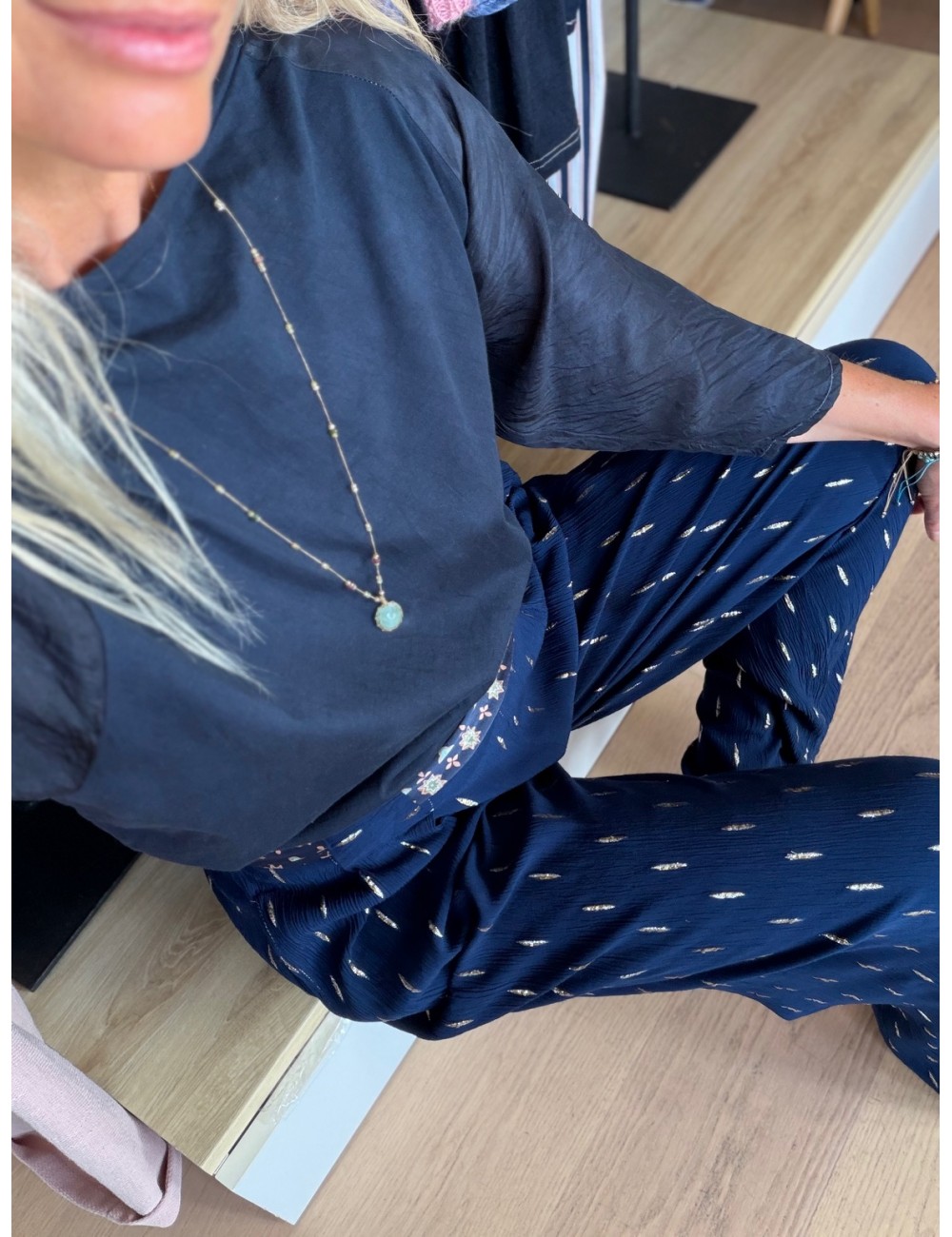 - Pantalon fluide en voile navy tie & dye plumetis argent/or