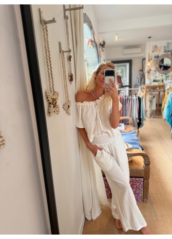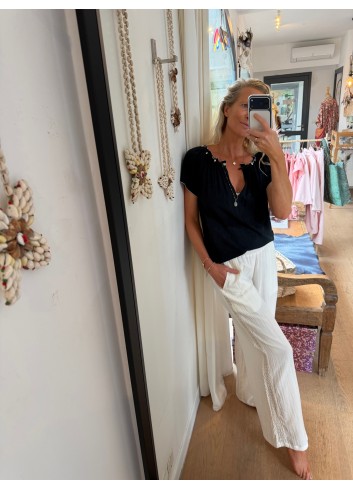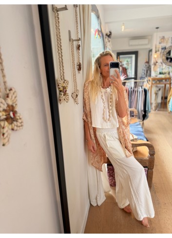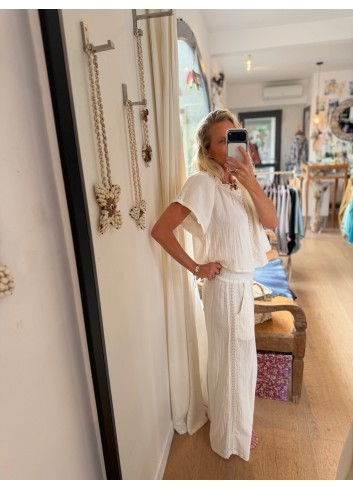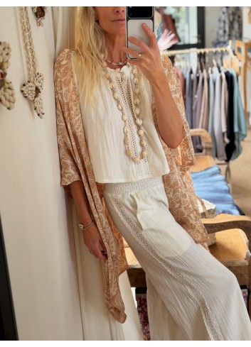 - Pantalon fluide large gaze de coton blanc et dentelle
