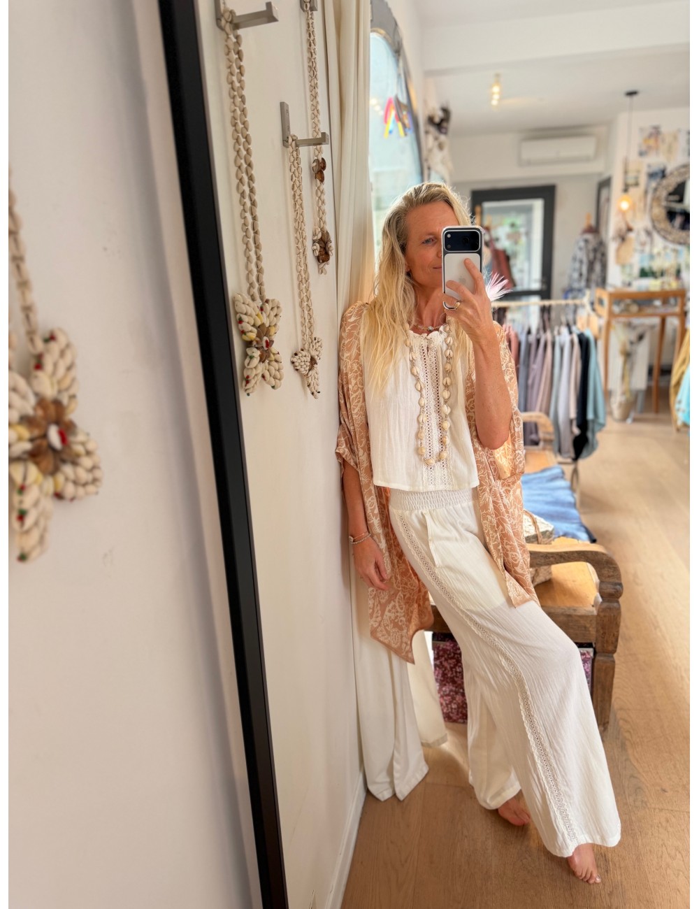 - encolure arrondie et bas du top brodés de coquillages cauri