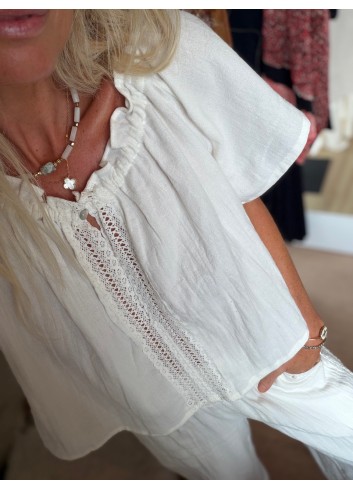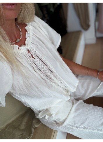 - Blouse fluide manches volantées en gaze de coton incrustation dentelle