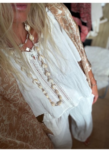 - encolure ras de cou brodée de coquillages cauri
