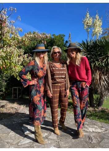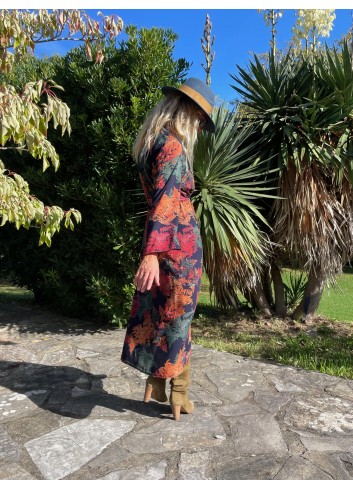 Robe longue boutonnée devant, taille resserrée par un lacet.