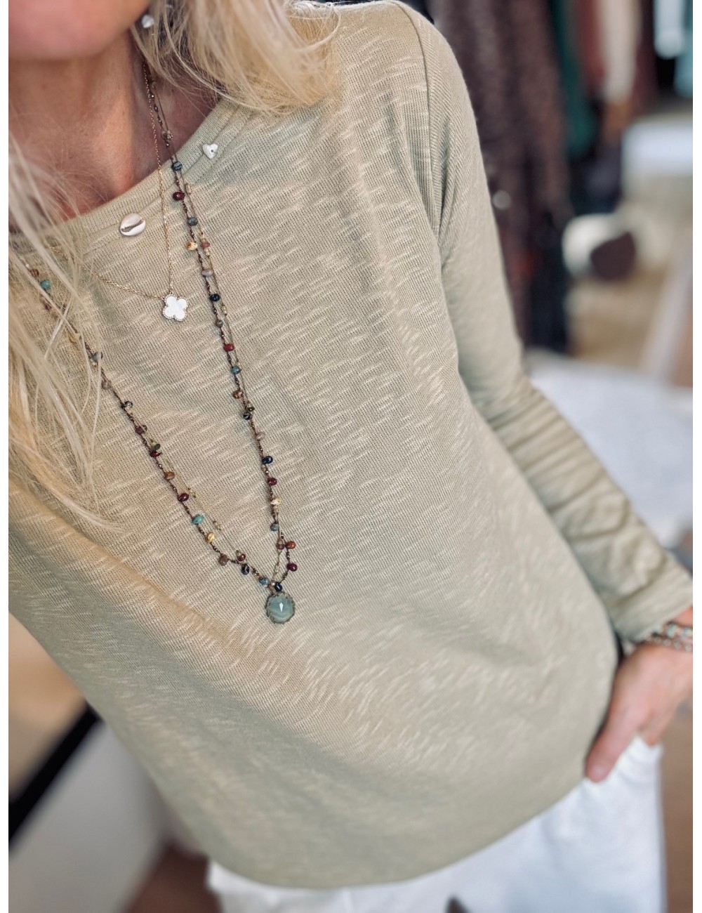 - encolure bateau brodée de coquillages cauri et pierres ton sur ton