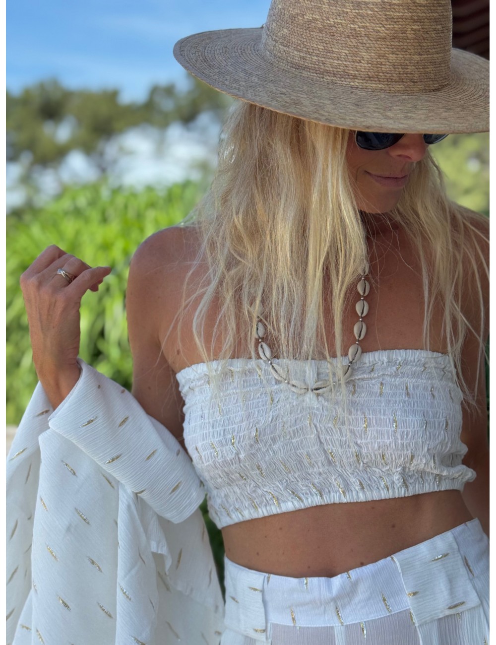 - encolure V brodée de coquillages cauri