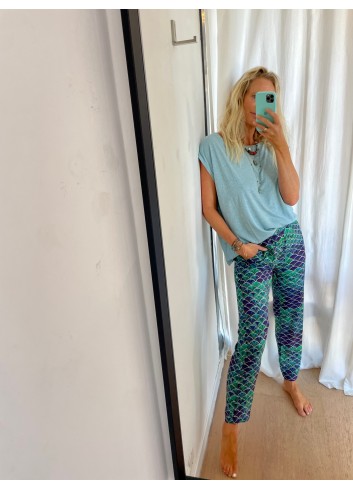 - cauris et pierres ton sur ton brodés en bas du pantalon froncé