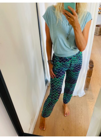 - Pantalon jegging en coton imprimé requins Kaki sur fond navy Blue