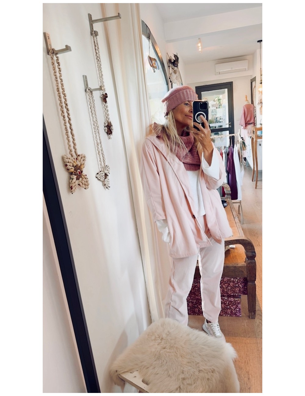 - cauris et pierres ton sur ton brodés en bas du pantalon froncé