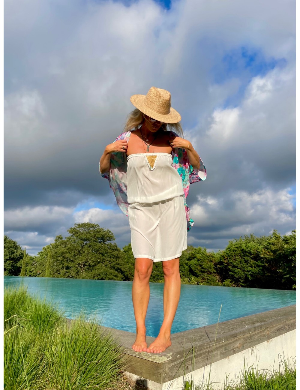 - Robe bustier longueur genoux en crêpe blanche ou noire