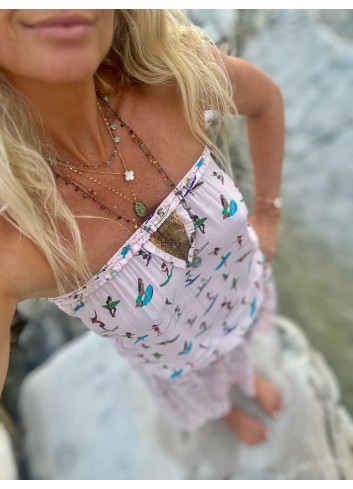 - Décolleté V brodé de coquillages cauris et pierres turquoises