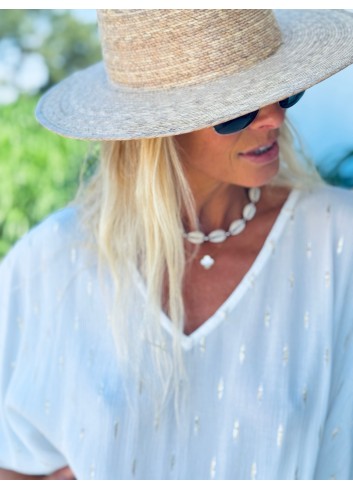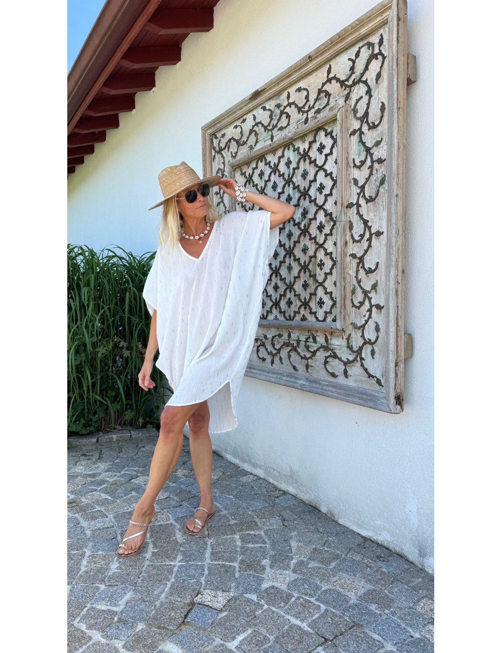 - Robe kimono en voile blanc plumetis lurex argent/or
