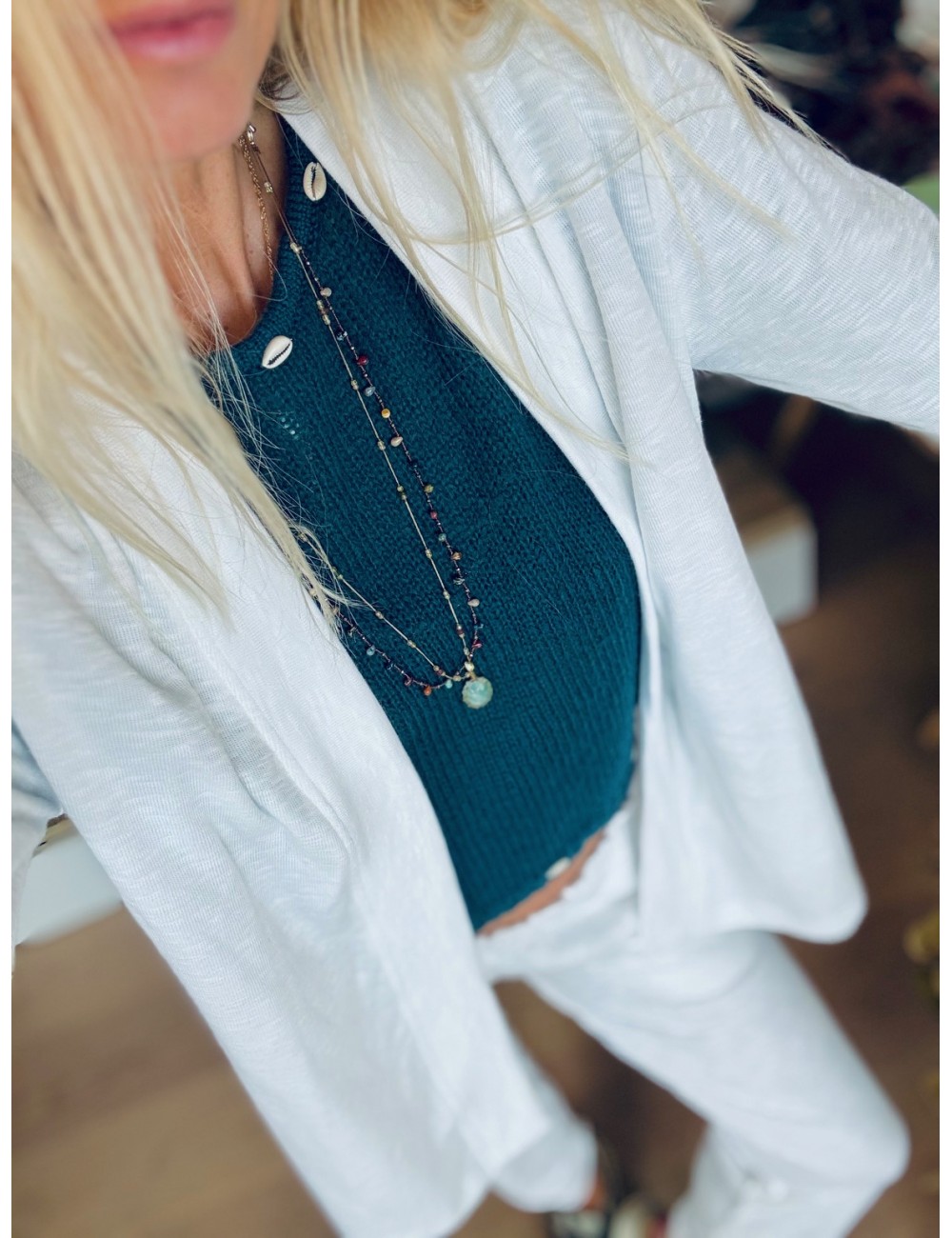 - Veste fluide en panne de velours de soie émeraude à porter en total look avec le pantalon ou la jupe assortie ou depareillée