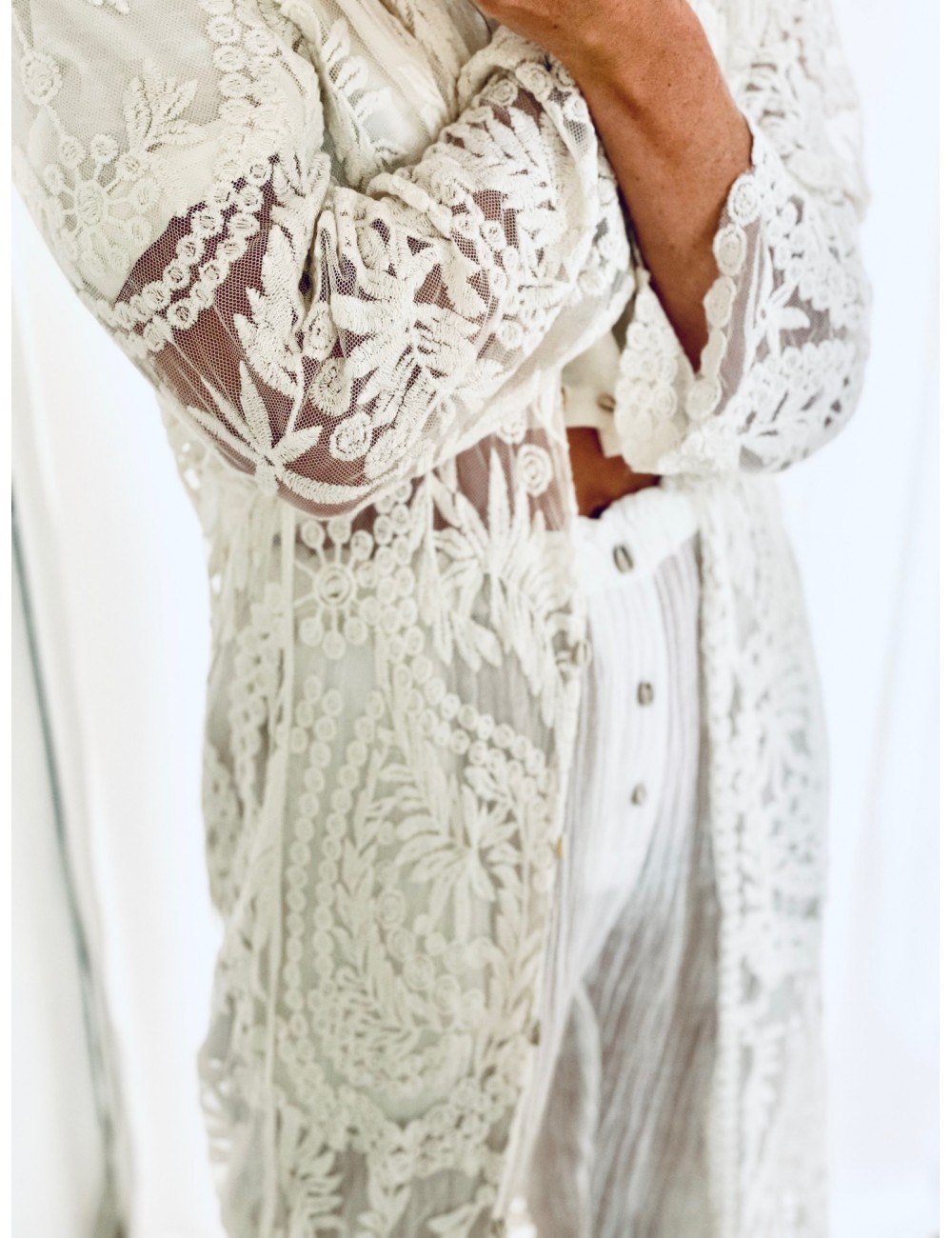 - Veste rose fluide style kimono brodée de pierres et cauris